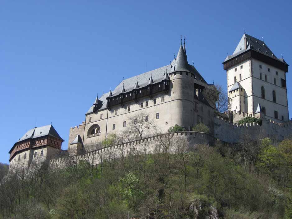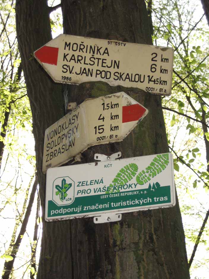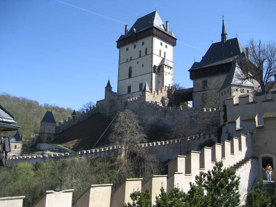 and KARLSTEJN CASTLE The little area of Karlstejn is situated in the Berounka Valley, surrounded by tall, rocky "hills" where the king made his retreat. The town is still tiny, one of the many dots on the railway line along the river. Czech is known for its hundreds of castles and this one, just south of Prague and an hour away from our home, is a mandatory stop for its natural location. Do you see the conductor walking across the tracks in the first picture. I gave the rail people heartfailure when I walked across it in Beroun because fast trains use the middle tracks and do not stop in smaller towns (and I had not seen the stairs to walk under the platforms -- now I know-- they nicely pointed it out to Lonnie before he did the same.)!! We followed the red & yellow trail signs out of town, both pointing in the same direction, and ended up on the wrong, but right trail for a photo of Lonnie with the castle in the distance. We followed a family on bicycles up the long hill while he gave a push to his little son. You can rent these sturdy mountain bikes at central railstations, carry it on the train, then get off and ride for the day on the many trails in the country, and return it in the evening. I cannot talk Lonnie into the bike route. "You don't have your hands free for photos and have to be watching the trail". We do enjoy the walking. The trails follow dirt roads along field sides, clearly marked on maps and seem to be public byways; they cross public roads but you generally don't have to walk on one unless it is through a small town. In the end we walked 4.5 hours to about 3 train stops away, along with the others out for the day. We expect to see many more castles in the coming days. Julie |