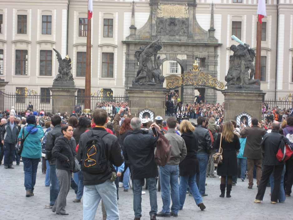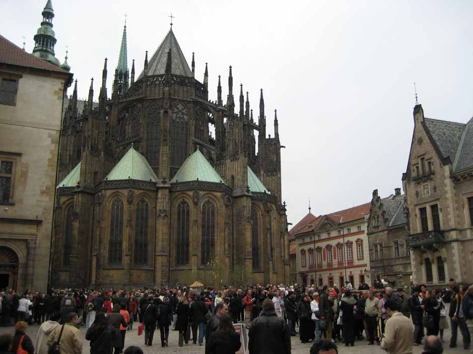 Easter Saturday Since most things are closed on Sundays and it would be Easter, and we thought everyone would be at church or with family, we decided to go to Prague on Easter Saturday. Were we wrong! Now we understand -- all of Europe is small, countries are close, anyone can run over to Prague for the holiday weekend, and EVERYONE DID. We decided to take an hour long bus to Prague and spend the day scoping it out, walking, no tours. It began with heavy gray skies, light rain and wind and ended with blue skies AFTER we had taken our castle pictures. Prague Castle looks like a huge church completely surrounded by very tall buildings for walls and towers to make it a "castle". All of the castle grounds and entrance to St. Vitus Church is free, so many come to just look around for the day as we did. For me the best part of Prague was walking across the St. Charles Bridge at sunset, seeing the old statues on the bridge, the water color painters, the boats on the river, and so many people strolling along like in old paintings. We will go back in June on a weekday and see it with blue skies and earlier in the day, but for now, this is our first Czech castle. |